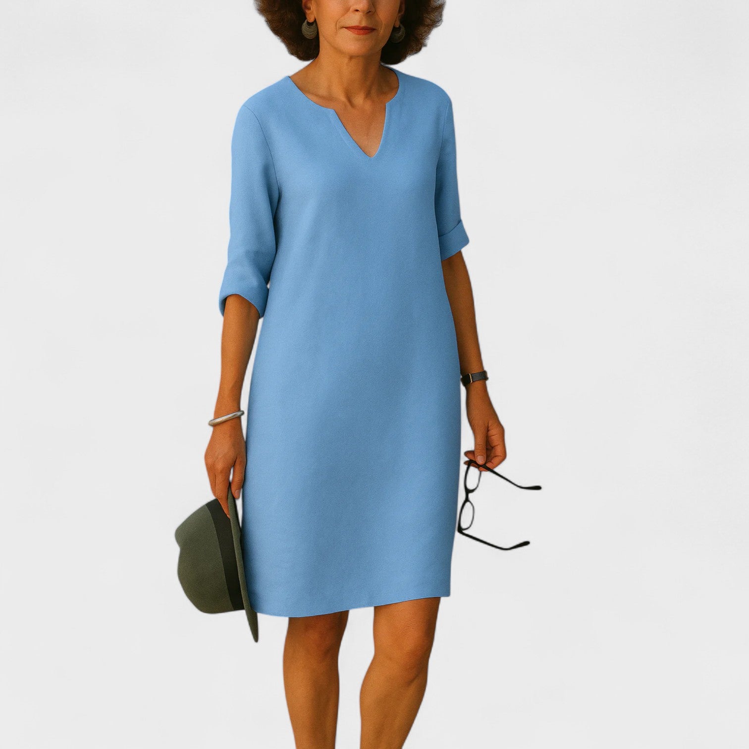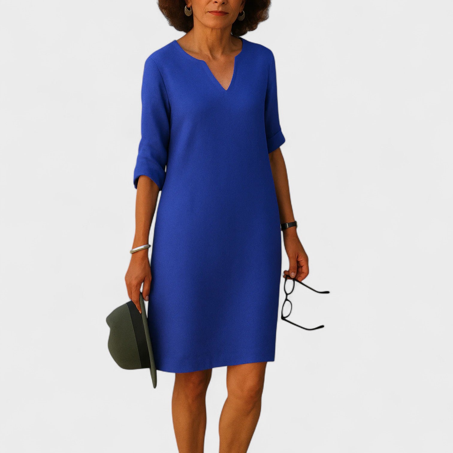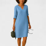 Düz kesimiyle bu elbise, sade ama etkileyici bir şıklık sunar. V yaka detayı ve 3/4 kol boyu ile vücuda zarifçe oturur, farklı vücut tiplerine uyum sağlar.