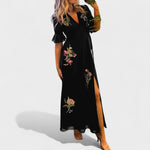Bu uzun elbise, zarif çiçek işlemeleriyle romantik ve sofistike bir görünüm arayanlar için mükemmel bir seçimdir. Akıcı kesimi ve yırtmaç detayı sayesinde silueti zarifçe vurgular; volanlı kollar ise feminen ve şık bir dokunuş katar.