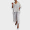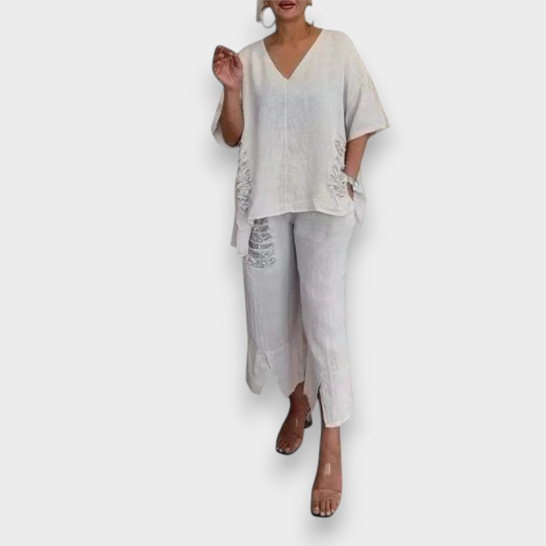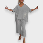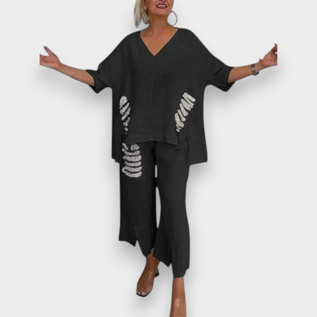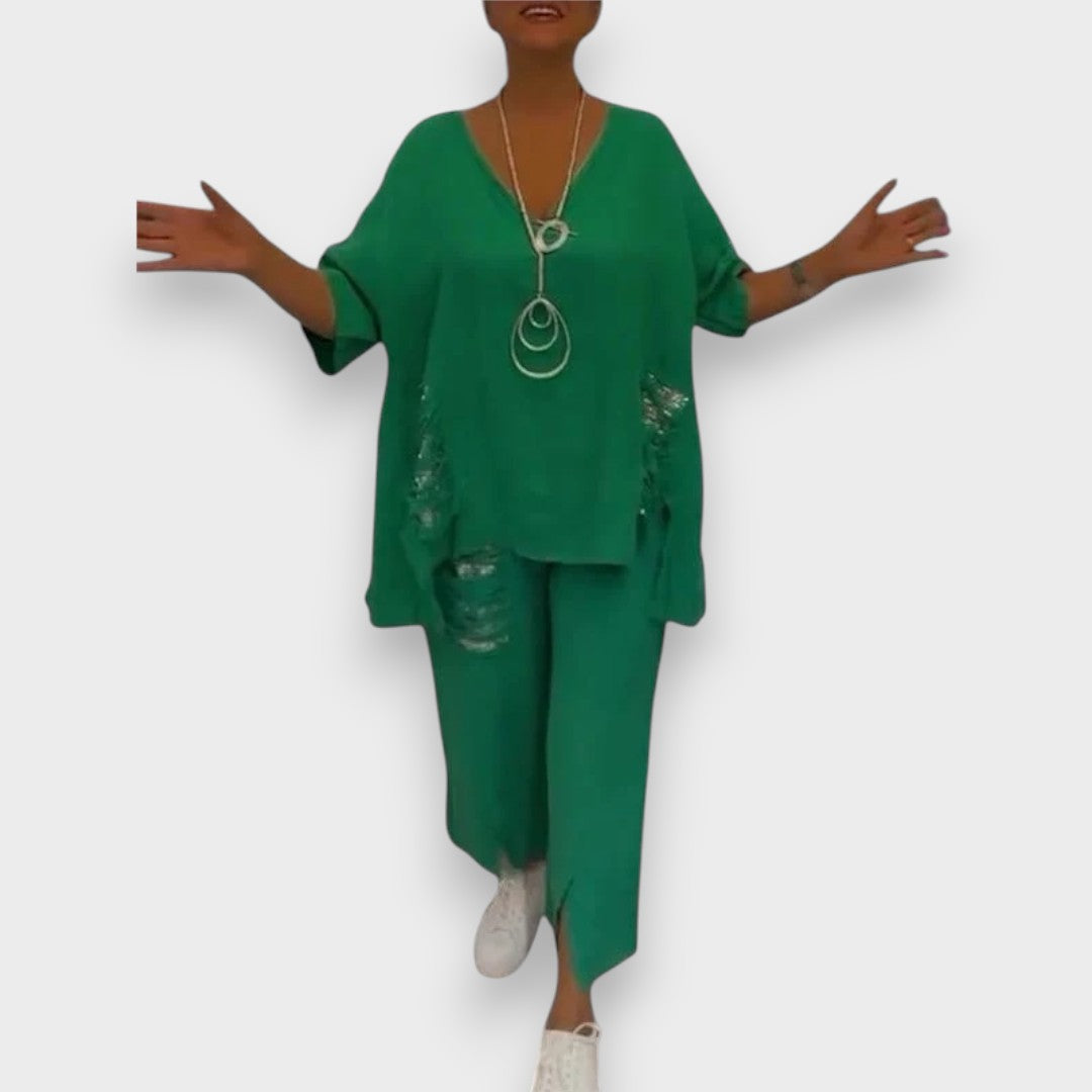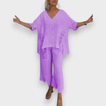 • Zahmetsiz şıklık – V yaka üst ve bol paça pantolon her bedene uyum sağlar