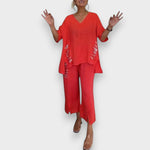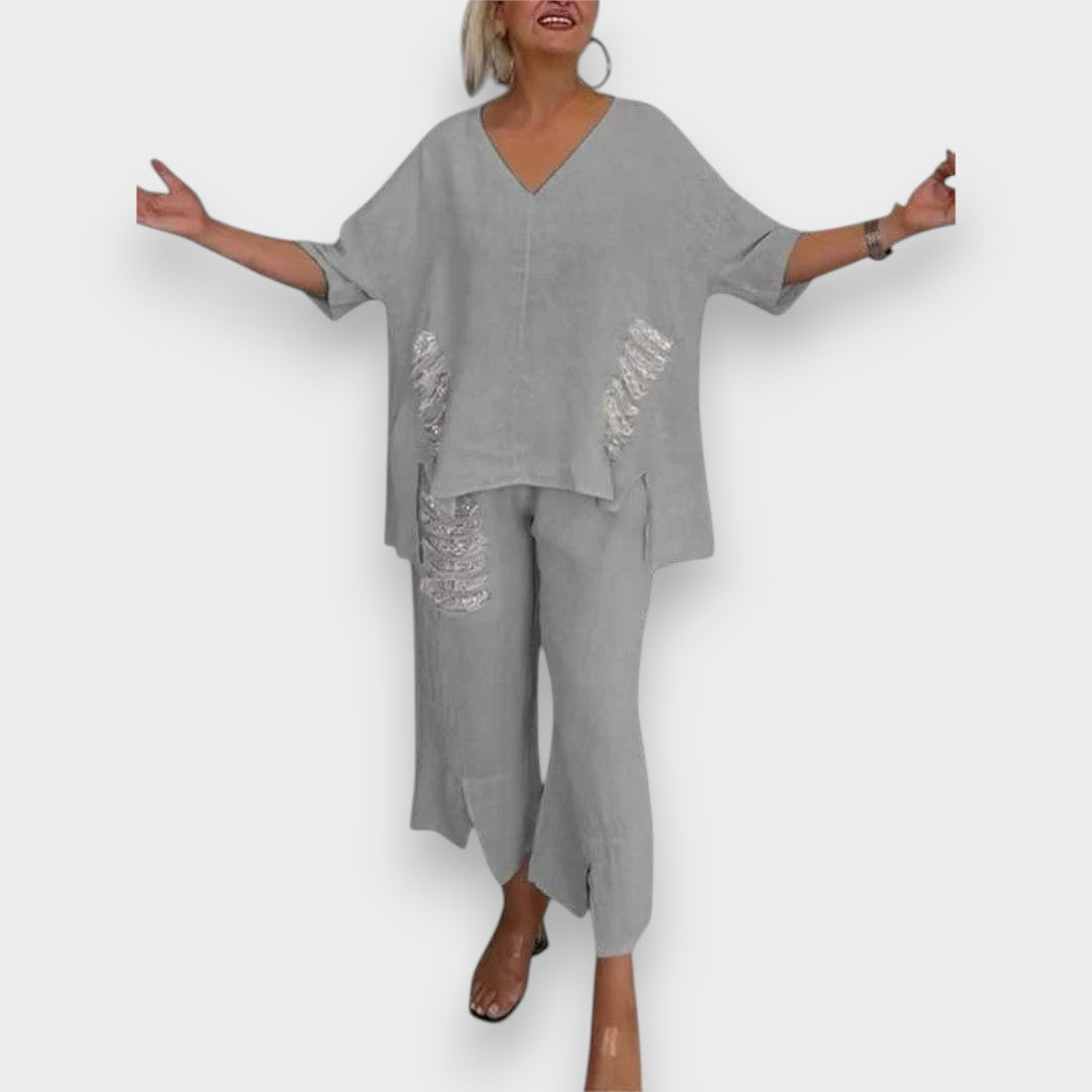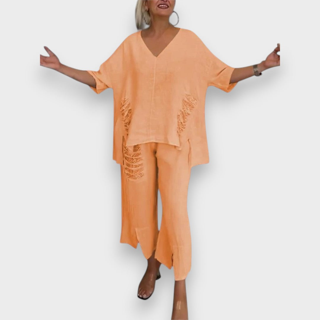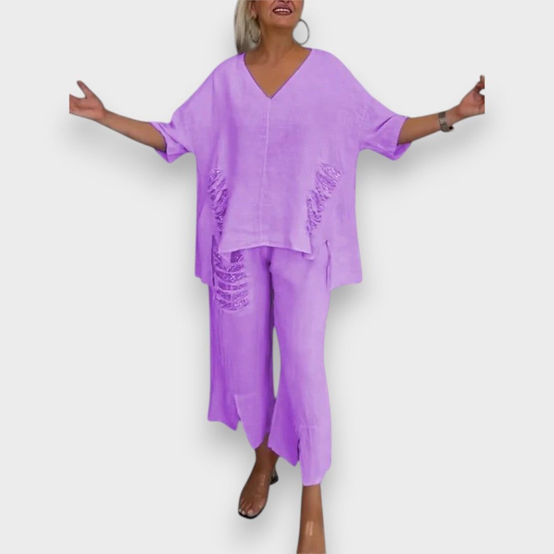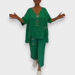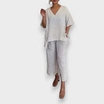Figen yazlık V yaka ikili takım, sıcak günler için hem şık hem de konforlu bir seçimdir. Hafif ve nefes alabilen kumaşı sayesinde serin kalırken, zarif tasarımıyla günlük stilinize zahmetsiz bir şıklık katar. İster şehirde ister tatilde – Figen her anınıza eşlik eder.