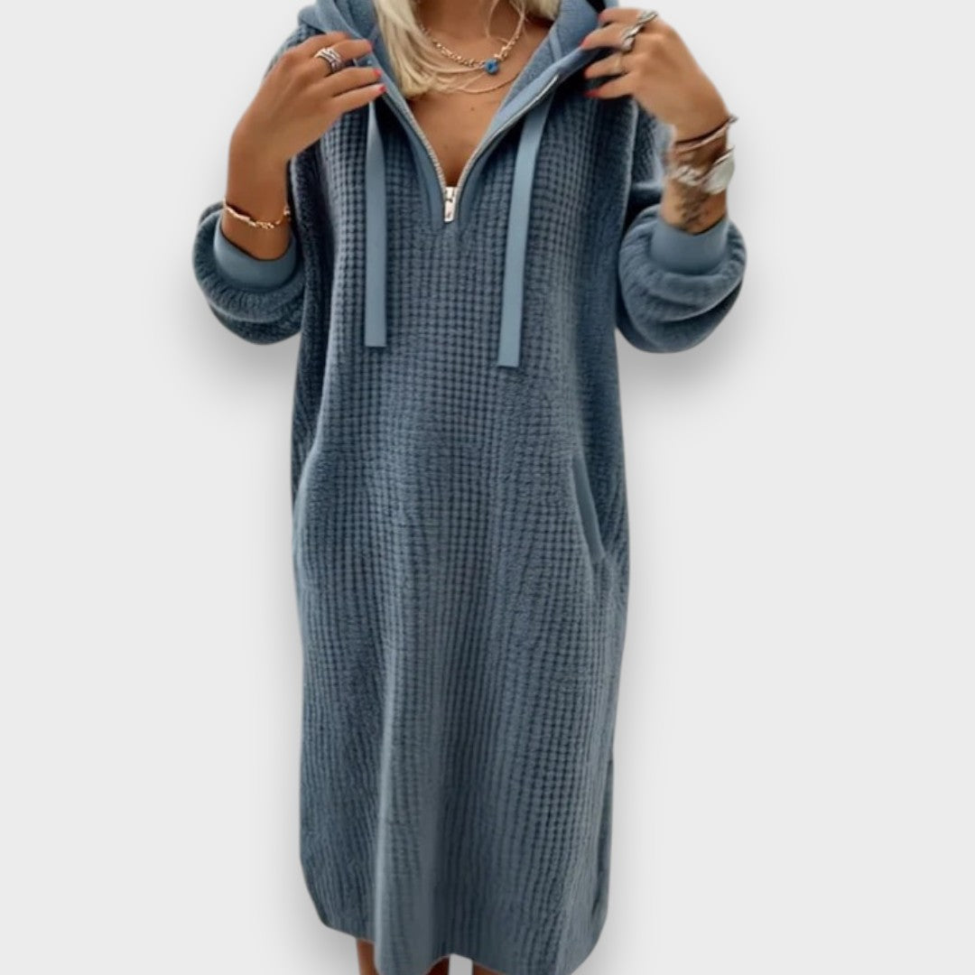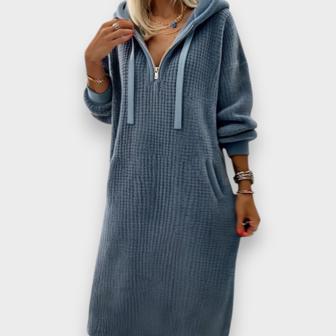 Alperenay | Rahat Kapüşonlu Petek Desenli Polar Elbise