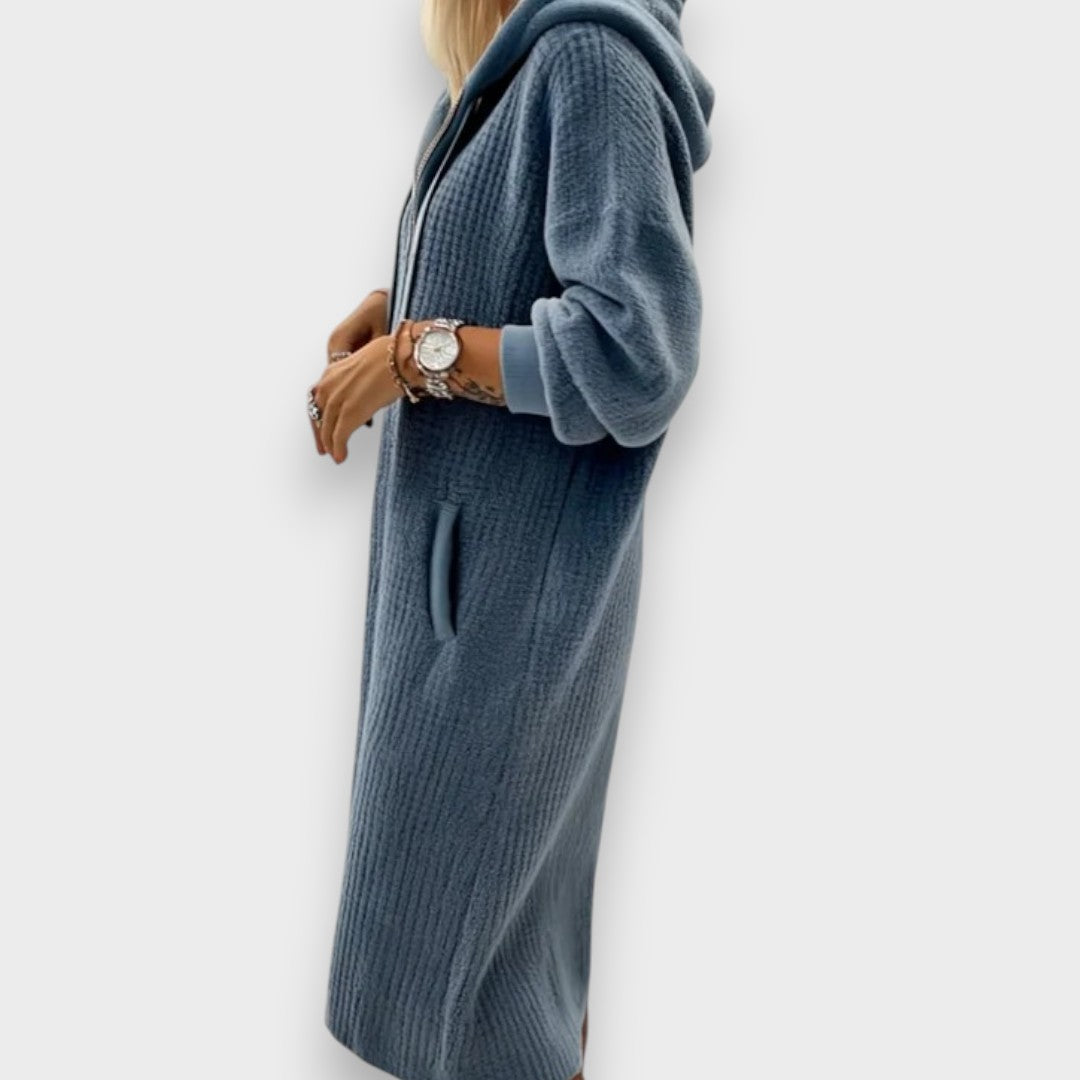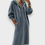 Alperenay polar elbise, petek (waffle) dokulu yumuşak yüzeyi ve kapüşonlu tasarımıyla serin havalarda sıcaklık ve konfor sunar. Orta boy (midi) uzunluğu, rahat kalıbı ve günlük kullanıma uygun sade görünümüyle sonbahar ve kış kombinlerinin kurtarıcı parçasıdır.