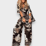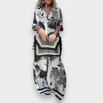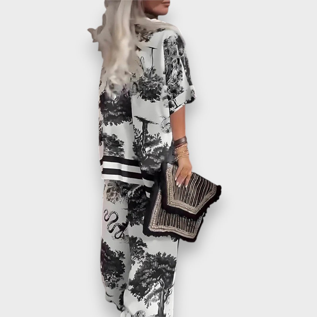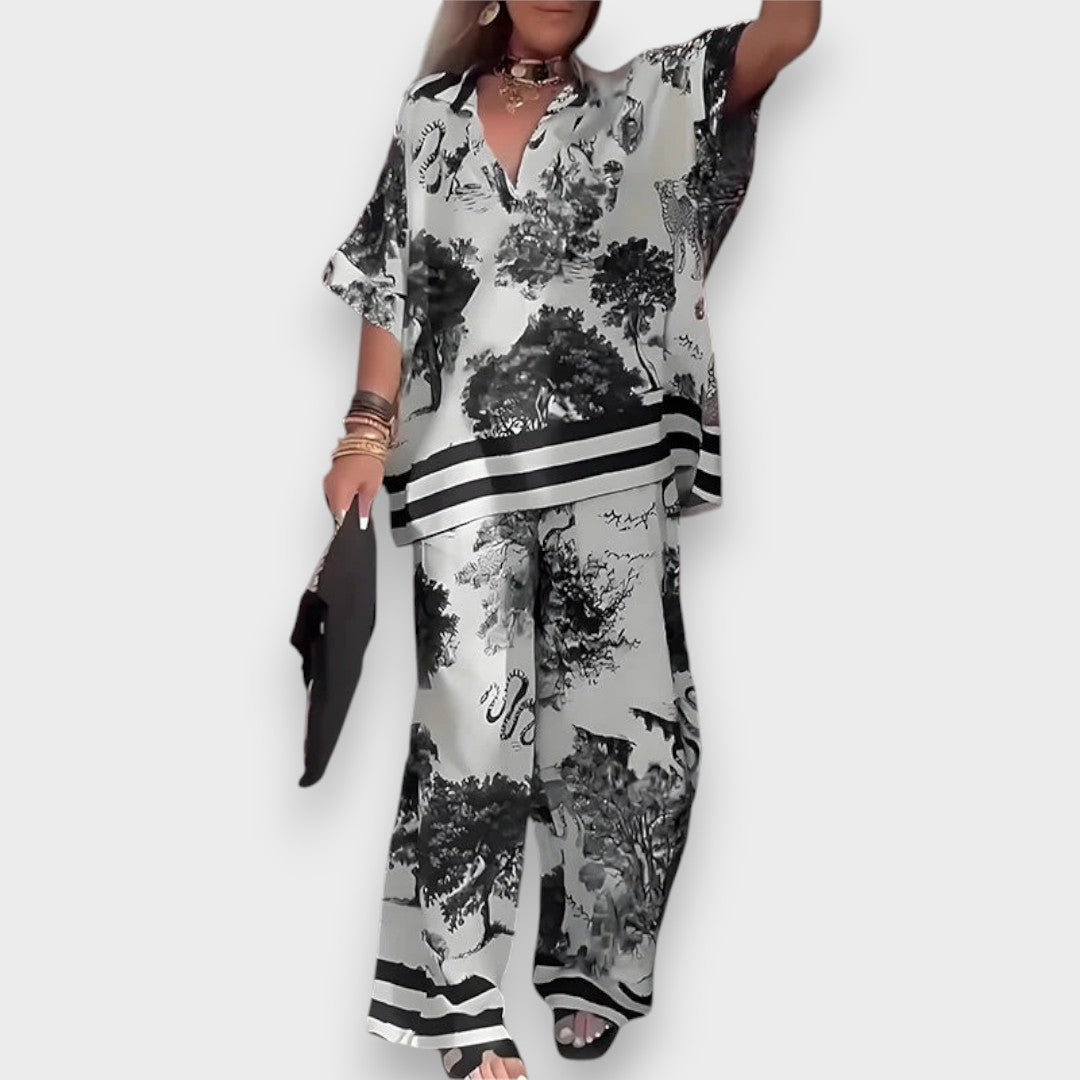 Amelya | V yaka baskılı üst ve uzun pantolon takımı