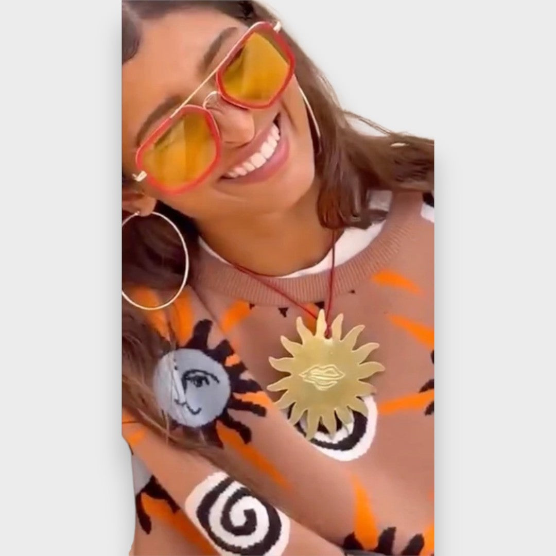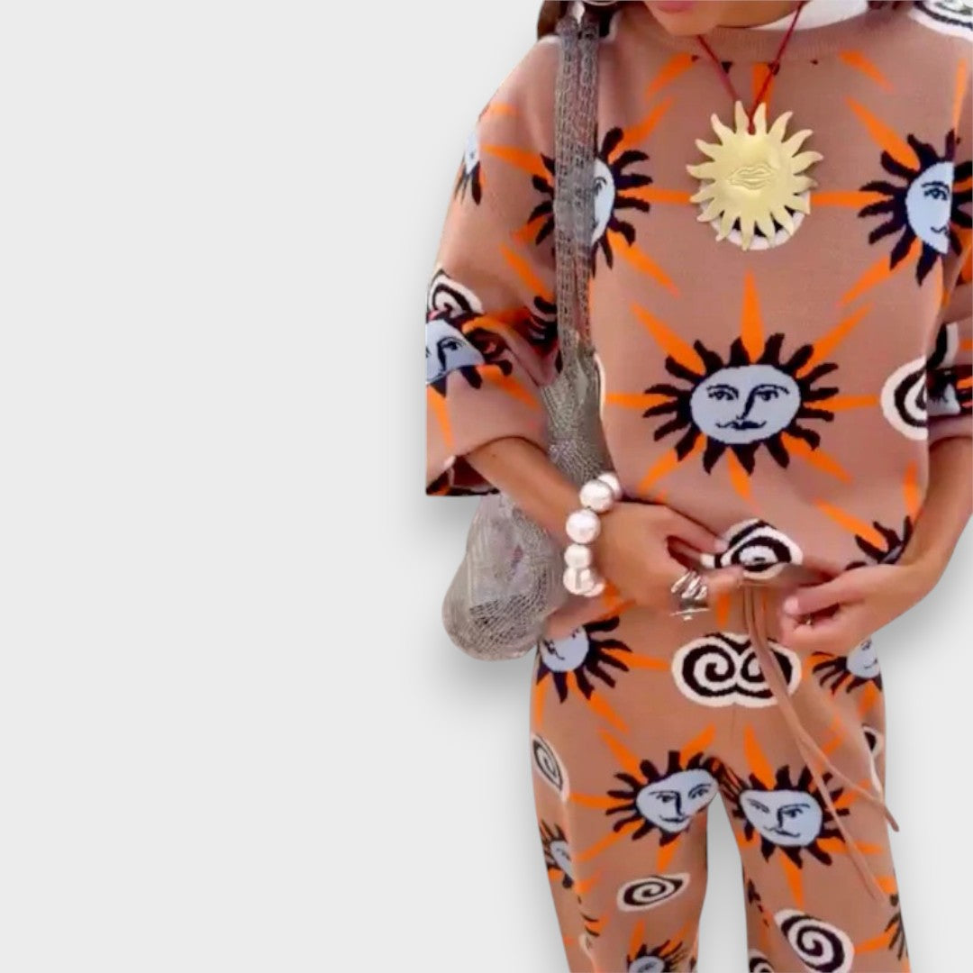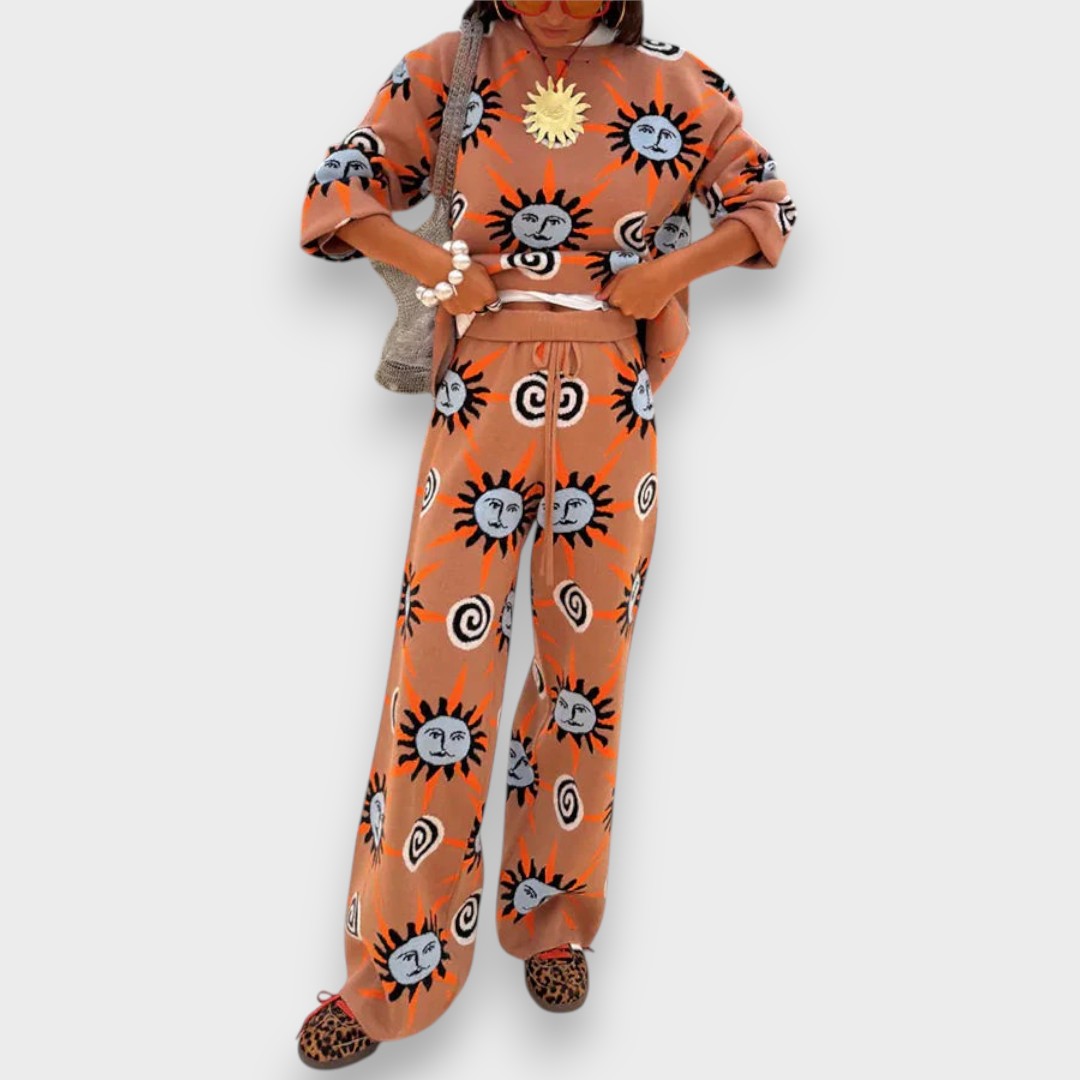 Canlı güneş ve spiral desenleriyle dikkat çeken Armina | Akdeniz Takımı, yumuşak dokusu ve rahat kesimiyle gün boyu konfor sunar. Oversize üst ve bağcıklı bol paça altıyla hem evde hem şehirde özgür bir stil yakalamanızı sağlar; enerjik renkleriyle Akdeniz’in sıcak ruhunu yansıtır.