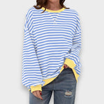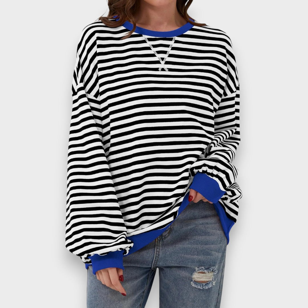 Asude kazak, neşeli çizgili deseniyle kombinlerinize taze bir görünüm katar. Yumuşak pamuk karışımı dokusu ve rahat kalıbıyla gün boyu konfor sunar; günlük, casual stiller için idealdir.