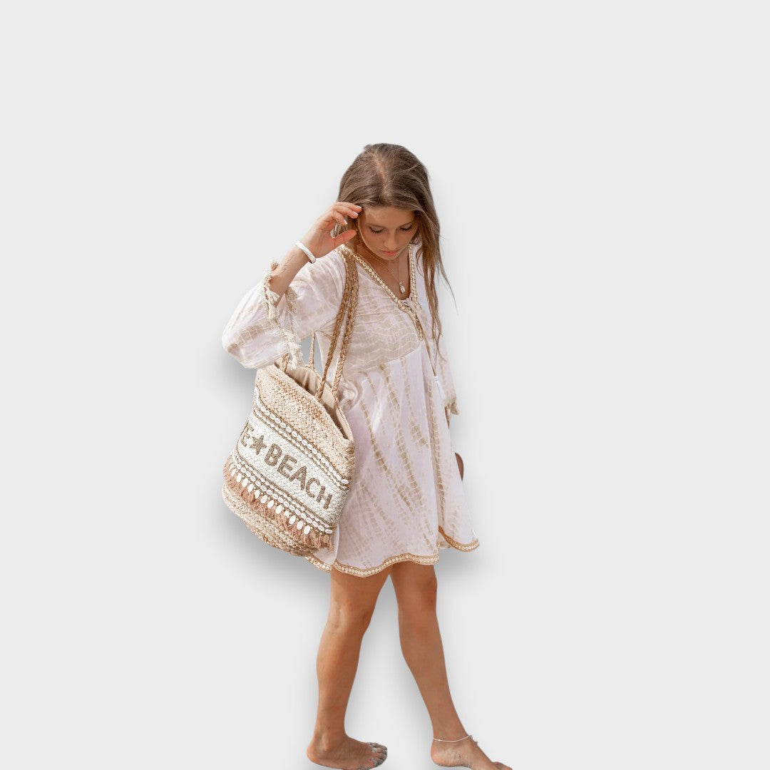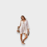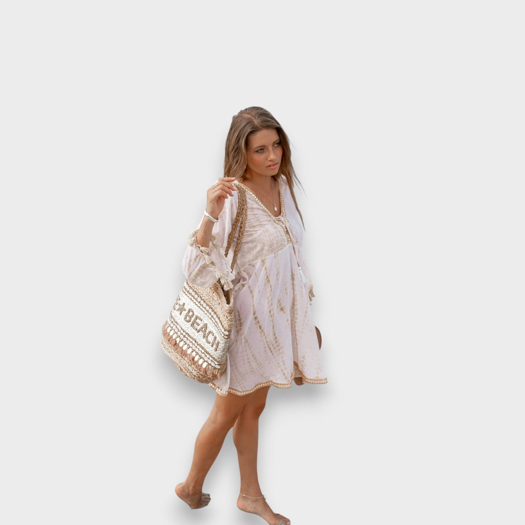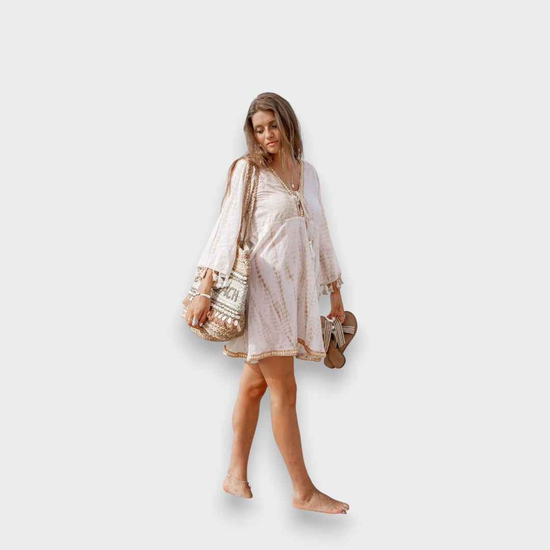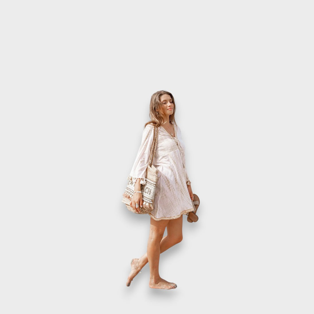 Hafif ve akıcı kumaşıyla yaz esintisini üzerinizde hissettiren Asude Nur | Batik Desenli Kısa Elbise, sahilden şehir sokaklarına uzanan günlerde ferah ve zarif bir görünüm sunar. V yaka bağcık detayı, salaş kollar ve uçlardaki zarif süslemelerle doğal şıklığı zahmetsizce tamamlar.