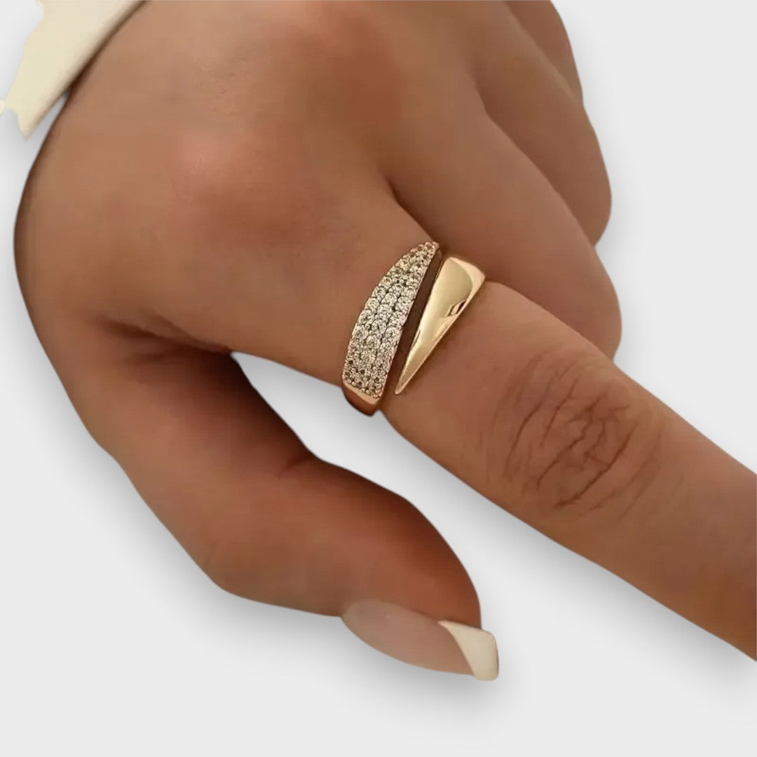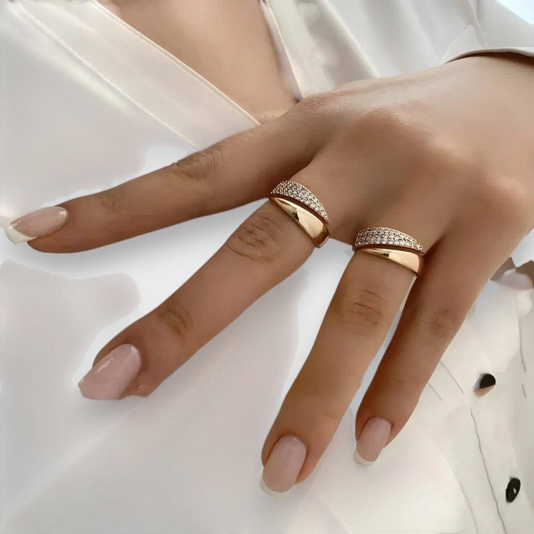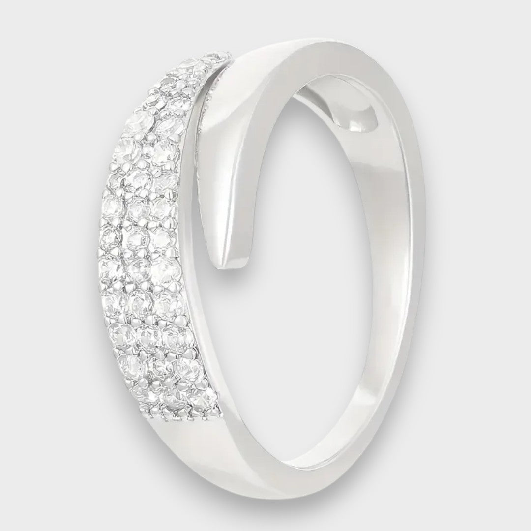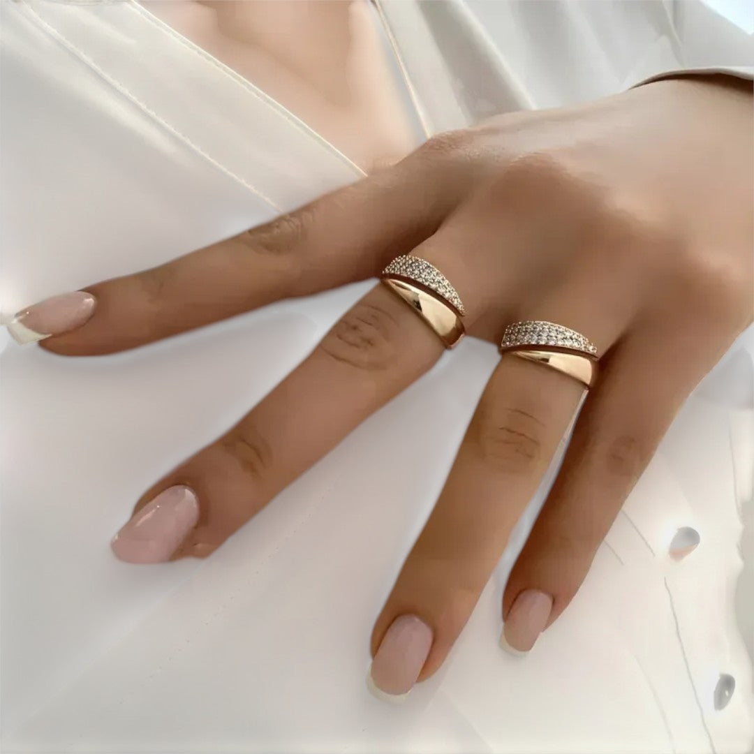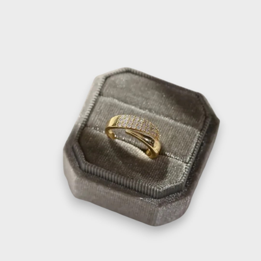 Atahan yüzük, ışığı yakalayan ışıltılı taşlarıyla lüks ve feminen bir görünüm sunar. Ayarlanabilir yapısı sayesinde parmağa rahatça oturur; hafif tasarımıyla gün boyu konforlu kullanım sağlar.