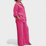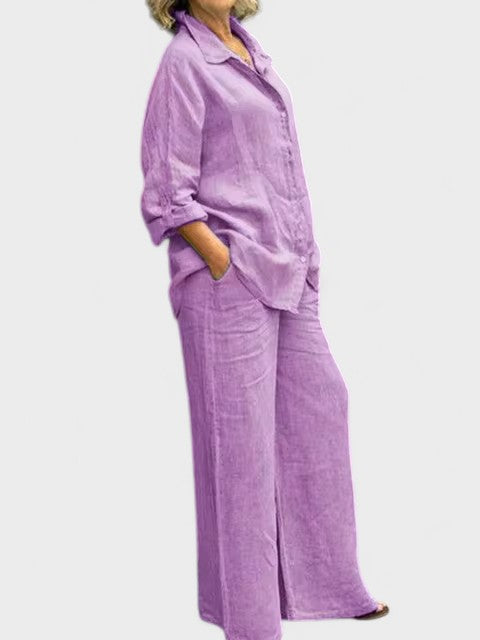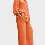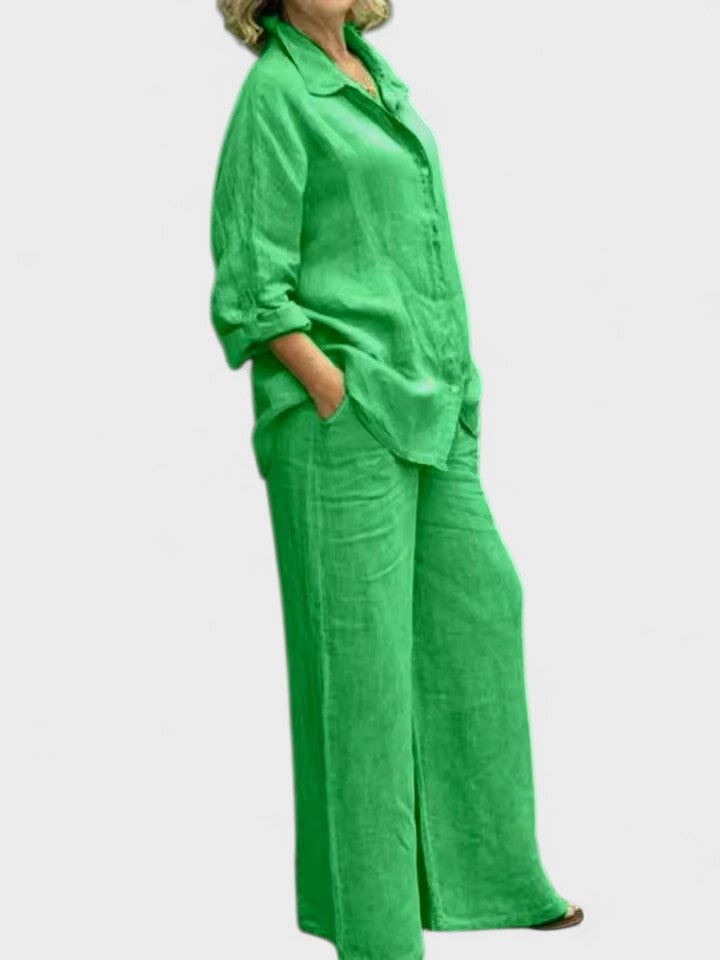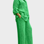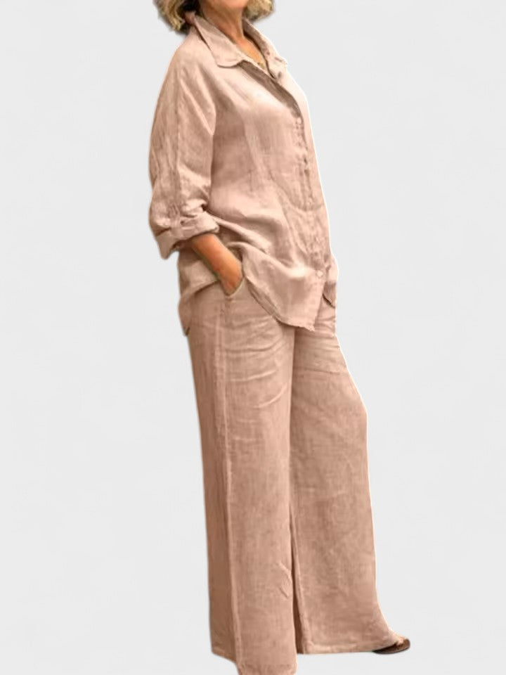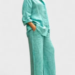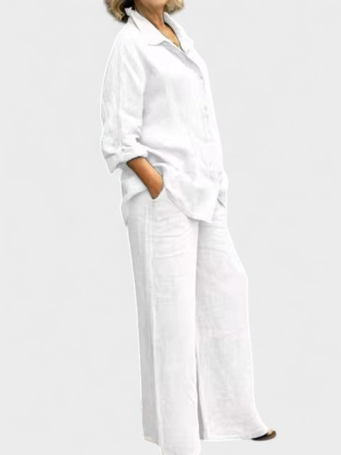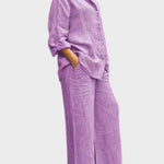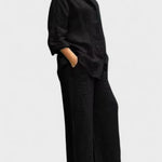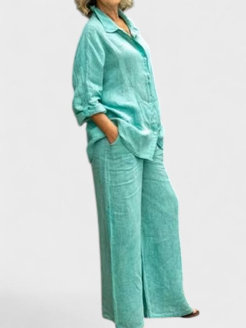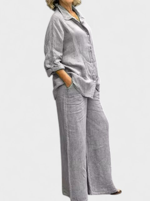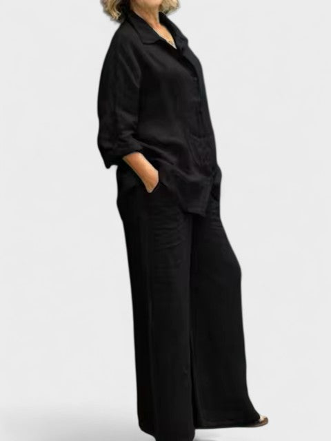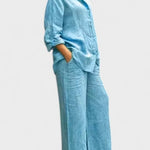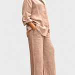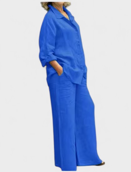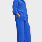 Bu gömlek ve palazzo pantolondan oluşan takım, modern görünümle sade şıklığı bir araya getiriyor. Rahat kesimli, kolları ayarlanabilir gömlek ve dökümlü, orta bel pantolon; hem gündelik kullanım hem de daha özel anlar için zarif bir alternatif sunar.