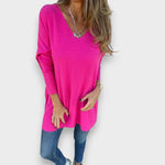 Pakize | Rahat V-Yaka Triko Tunik, yumuşak triko dokusu ve bol, oversize kalıbıyla tek başına ya da katmanlı kullanım için mükemmel bir parçadır. V-yaka kesimi feminen bir dokunuş sunarken; uzun tunik boyu konfor ve kapatıcılık sağlar. Zamansız, pratik stil sevenler için ideal tercihtir.