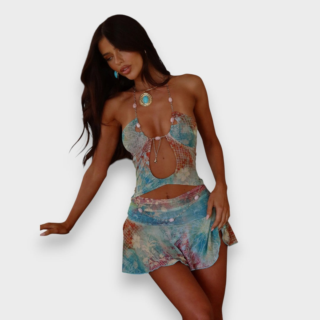 Zeliha™ Opal Topaz Glow elbise, cesur renkleri ve neredeyse transparan zarafetiyle dikkat çeker. Vücuda oturan tasarımı sayesinde kendinizi özgüvenli hissedeceksiniz. İster sahil akşam yemeklerinde, ister teras kokteyllerinde ya da yaz gecelerinde – Zeliha™ her ortamda size eşlik eder.